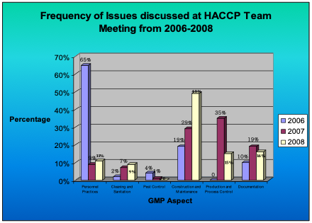A comparative analysis of the HACCP meeting issues for a 3 year period (2006 -2008) can be seen in Figure 2. An 86% decrease was noted in the issues discussed relating to personnel practices from 2006 to 2007. However, a slight increase of 18% was noted from 2007 to 2008.