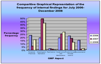 The Internal Audit Reports for 2006, 2007 and 2008 were analyzed to determine the GMP category of issues that were dealt with during this time. The frequency of issue per GMP category was then calculated for each year and the findings were summarized with the comparative analysis for each year displayed in Figure 3.